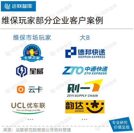 這類企業(yè)皆以快遞、快運企業(yè)為抓手,企圖快速將業(yè)務(wù)鋪開,以獲取足夠多的市場份額,先人一步占領(lǐng)細(xì)分領(lǐng)域。大成、星威、優(yōu)車聯(lián)、云卡等維保玩家以快遞、快運客戶開場,且皆為大B,如德邦快遞、中通快遞、極兔速遞、則一供應(yīng)鏈等物流公司/車隊。