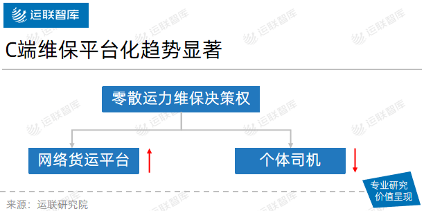 零散運力的維保采購權(quán)可分為兩類:一類是被網(wǎng)絡(luò)貨運平臺整合的零散運力,維保決策權(quán)掌握在平臺手中;另一類是未被平臺整合的零散運力,維保決策權(quán)仍然在個體司機(jī)手里。隨著零散運力的組織化變革進(jìn)一步加深,C端維保平臺化趨勢顯著,平臺型企業(yè)有望成為維保服務(wù)新增量。