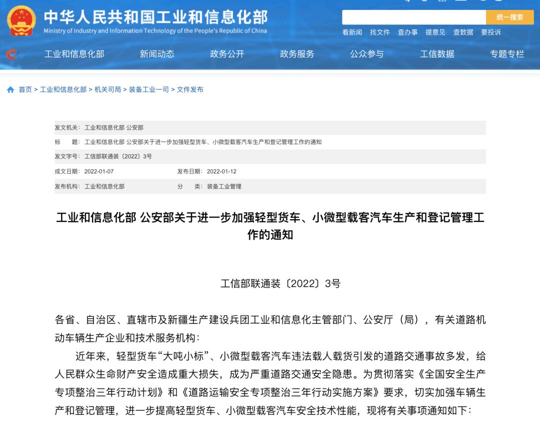 2022年1月12日,工業(yè)和信息化部、公安部聯(lián)合發(fā)布《關(guān)于進(jìn)一步加強(qiáng)輕型貨車、小微型載客汽車生產(chǎn)和登記管理工作的通知》(下簡稱《通知》)。《通知》明確,不符合通知《輕型貨車、小微型載客汽車安全技術(shù)規(guī)范》要求的在產(chǎn)產(chǎn)品,2022年3月1日起,生產(chǎn)企業(yè)應(yīng)立即停止生產(chǎn),相關(guān)機(jī)構(gòu)應(yīng)立即停止接收相關(guān)產(chǎn)品合格證信息。