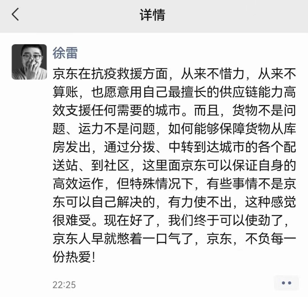 徐雷表示,京東在抗疫救援方面,從來不惜力,從來不算賬,也愿意用自己最擅長的供應(yīng)鏈能力高效支援任何需要支援的城市。貨物從庫房發(fā)出通過分撥、中轉(zhuǎn)到達(dá)城市的各個(gè)配送站、到社區(qū),這里面京東可以保證自身的高效運(yùn)作……